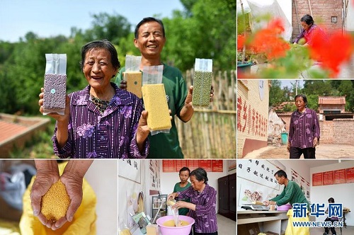 張成華,女,1949年出生,山西省長治市武鄉(xiāng)縣嶺頭村人。近年來,嶺頭村在縣里有關(guān)部門的扶持下,對(duì)村民開展電商培訓(xùn)。村民們嘗試著在手機(jī)上“開店”,把小米、核桃、綠豆等農(nóng)產(chǎn)品在網(wǎng)絡(luò)上售賣。張成華的兒子魏寶玉開了網(wǎng)店后,自家的農(nóng)產(chǎn)品在網(wǎng)上銷售良好,家庭收入明顯增加。 左上:張成華(前)和兒子魏寶玉展示自家種的農(nóng)產(chǎn)品;右上:張成華在家中院子里收拾;右中:張成華走在村里的路上;右下:張成華的兒子魏寶玉將準(zhǔn)備發(fā)貨的農(nóng)產(chǎn)品進(jìn)行稱重;下中:張成華(前)將小米裝袋;下左:張成華在查看小米質(zhì)量(拼版照片,6月12日攝)。 地處晉東南的山西省長治市,位于由太行山、太岳山環(huán)繞而成的上黨盆地中。在群山中、崖壁上,許多村莊自然條件惡劣,基礎(chǔ)設(shè)施落后,脫貧致富是大山深處人們的迫切心愿。 近年來,一場場脫貧攻堅(jiān)戰(zhàn),在一個(gè)個(gè)深山村打響。政府全力探索脫貧路徑的同時(shí),山區(qū)百姓因地制宜,靠自己的雙手和智慧走上致富路,交出了一份扎實(shí)的脫貧答卷。 記者在太行山、太岳山一路尋訪,記錄下多位70歲老人的生活。這些共和國的同齡人,親歷了山鄉(xiāng)的巨變,見證著長治山區(qū)脫貧攻堅(jiān)偉大工程的一步步推進(jìn)。 新華社記者 詹彥 攝