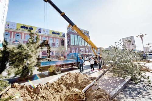 圖為園林工人在長(zhǎng)征街挖運(yùn)油松。智芝龍 趙曉煒 攝