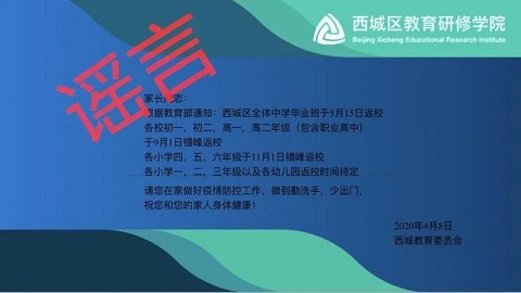 近日,“北京高三4月27日開學(xué),六年級(jí)和初三5月11日開學(xué)” 、“西城區(qū)全體中學(xué)畢業(yè)班5月15日返?!薄ⅰ氨本┠硡^(qū)教委接到通知,確認(rèn)9月1日前不會(huì)復(fù)學(xué)”等一系列消息在網(wǎng)上流傳。