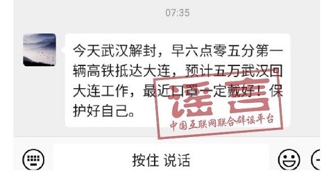 4月8日,有消息稱:“今天武漢解封,早六點(diǎn)零五分第一輛高鐵抵達(dá)大連,預(yù)計(jì)五萬武漢人回大連工作,最近口罩一定戴好……”。