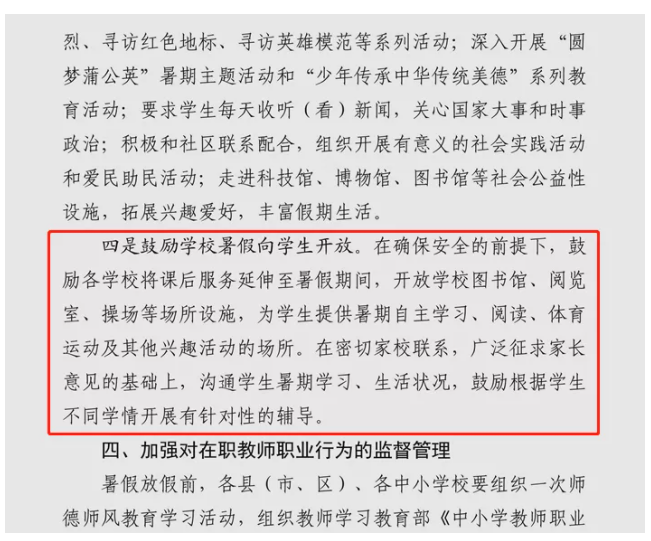 河南省安陽市教育局表示,充分考慮到暑假師生的身心狀況,每天時間總量不超過4小時,總時間不超過四周。在放假后和開學(xué)前均留出10天左右的休息時間,讓老師和學(xué)生有放松期和調(diào)整期。