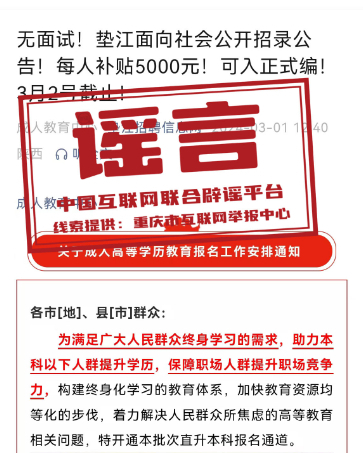 真相:近日,“墊江招聘信息網”微信公眾號發(fā)布信息:“無面試!重慶墊江面向社會公開招錄公告!每人補貼5000元!可入正式編!”部分網民看到該信息后誤認為,墊江面向社會以補貼形式招錄具有正式編制的公務人員,于是紛紛向墊江縣有關部門致電咨詢招錄情況。經核實,近年來,墊江未曾以補貼方式和不經過面試招錄具有正式編制公務人員。該信息實則為成人學歷提升培訓信息,而非正式編制公務人員招錄信息。墊江縣互聯(lián)網信息辦公室已依法對發(fā)布該信息的微信公眾號負責人進行約談和教育批評,指出虛假信息的危害性,并責令刪除相關信息。(來源:重慶辟謠)