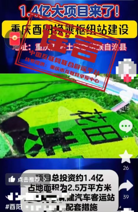 真相:近日,有網(wǎng)民發(fā)布信息稱“1.4億大項(xiàng)目來了,重慶酉陽換乘樞紐站建設(shè),新建汽車客運(yùn)站及相關(guān)配套”,引發(fā)關(guān)注。經(jīng)重慶市酉陽縣交通運(yùn)輸委核實(shí),酉陽縣正在推進(jìn)桃花源景區(qū)游客集散中心提升項(xiàng)目,暫無“1.4億建設(shè)換乘樞紐站”項(xiàng)目,網(wǎng)傳信息系謠言。(來源:“重慶辟謠”微信公眾號)