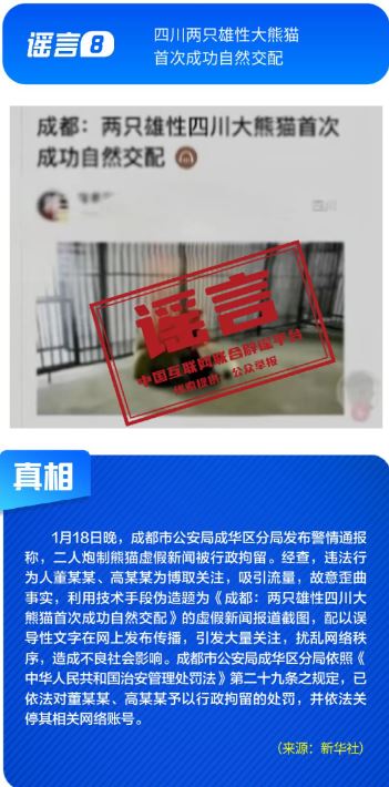 ??針對各類網(wǎng)絡(luò)謠言與亂象,多部門開展協(xié)同治理,聯(lián)動整治。1月16日,中央網(wǎng)信辦召開全國網(wǎng)絡(luò)辟謠聯(lián)動機制第三次全體會議,部署以辟謠工作新成效助力清朗網(wǎng)絡(luò)空間建設(shè)。中央網(wǎng)信辦聯(lián)合工業(yè)和信息化部等部門持續(xù)整治汽車行業(yè)網(wǎng)絡(luò)亂象,處置一批涉嫌挑動對立、炒作負面話題、違規(guī)測評的賬號;國家廣播電視總局開展“AI魔改”視頻專項治理,各平臺處置大量違規(guī)內(nèi)容。各地網(wǎng)信部門積極行動,陜西西安深入開展房地產(chǎn)領(lǐng)域網(wǎng)絡(luò)專項行動,處置散布樓市謠言的房產(chǎn)中介賬號,四川成都依法處置30余個惡意關(guān)聯(lián)地域、污名化城市的違規(guī)賬號。公安機關(guān)依法打擊造謠傳謠人員。擺拍“小女孩在學(xué)校跳蚤市場用50元淘到名酒”、利用AI偽造“假救護車非法轉(zhuǎn)運”、編造“兩只雄性四川大熊貓首次成功自然交配”等謠言的相關(guān)責任人已依法被予以行政處罰。