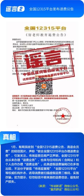 ??公共政策領(lǐng)域謠言誤導(dǎo)公眾決策?!吧绫?]有有效期限制、未到期不能換新卡”是對社保卡管理政策的誤讀,給民眾平添困擾;“28家博物館元旦期間閉館”實為少數(shù)博物館根據(jù)運營安排所做的微調(diào),網(wǎng)帖嚴重夸大實際閉館情況,引發(fā)負面炒作;“深圳有望推行12年義務(wù)教育,高中免費”是對現(xiàn)行政策的“超前編造”,誤導(dǎo)學(xué)生及家長群體;“全國12315平臺發(fā)布退費公告”,則是假冒監(jiān)管機構(gòu)名義散播不實通知,為后續(xù)詐騙行為做鋪墊。