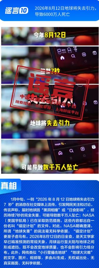??健康與科普領(lǐng)域謠言違背客觀規(guī)律?!叭搜椎鞍资恰黾用庖吡Α姆▽殹笨桃饪浯笤撎幏剿幍呐R床用途,忽略其特定醫(yī)療場景與使用風險;所謂“大棚草莓、冷庫葡萄、進口車厘子、染色砂糖橘是冬天水果界四大毒王”謠言片面解讀農(nóng)產(chǎn)品種植與保鮮方式,缺乏科學(xué)依據(jù);“四川兩只雄性大熊貓首次成功自然交配”純屬為吸引流量而捏造的獵奇內(nèi)容,其視頻畫面為AI生成;“2026年8月12日地球?qū)⑹ヒ?,?dǎo)致6000萬人死亡”更是無中生有的荒謬謠言。