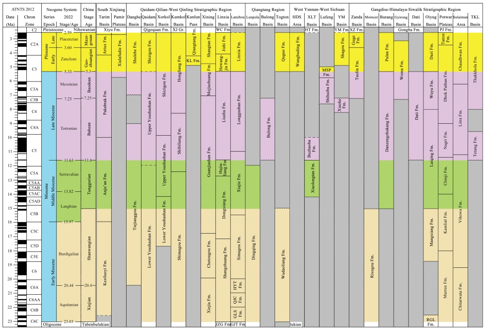 中國的新近紀(jì)年代地層系統(tǒng)分為中新統(tǒng)的謝家階、山旺階、通古爾階、灞河階、保德階5個(gè)階,以及上新統(tǒng)的高莊階和麻則溝階2個(gè)階。研究提出,在青藏高原新生代陸相地層的劃分對(duì)比和測年標(biāo)定上,哺乳動(dòng)物化石起到非常重要的作用。