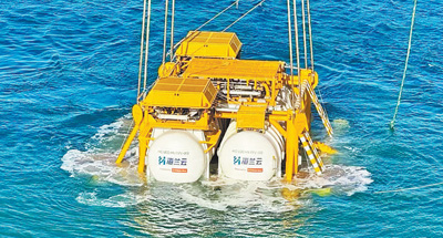 在海南省陵水黎族自治縣英州鎮(zhèn)清水灣的海面上,一艘起重船巨臂高擎,緩緩下落。船上,工作人員緊盯著潛水控制臺的屏幕,手中精準(zhǔn)操作,重達(dá)1300噸的“海底數(shù)據(jù)艙”穩(wěn)穩(wěn)沉入35米深的海底。