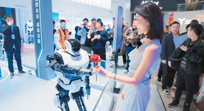 3月14日,在上海市舉辦的中國(guó)家電及消費(fèi)電子博覽會(huì)上,海爾公司的AI人形家庭機(jī)器人現(xiàn)場(chǎng)向人們贈(zèng)送玫瑰。陳玉宇攝(人民視覺)
