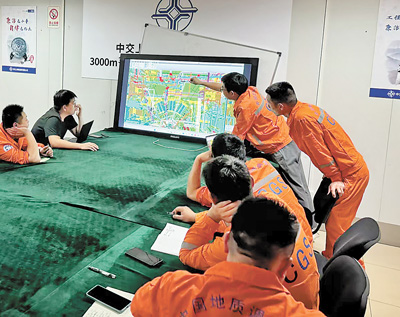“夢(mèng)想”號(hào)指揮部主要負(fù)責(zé)人周昶(前)在動(dòng)力控制室查看船上情況。 中國地質(zhì)調(diào)查局宣傳教育中心供圖