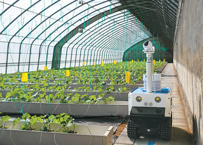 3月21日,無(wú)人巡檢機(jī)器人在天津一家智慧農(nóng)業(yè)園區(qū)內(nèi)巡控。新華社記者 孫凡越攝