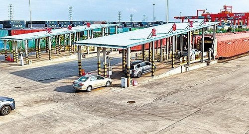 廣州國際物流港基地,工作人員駕駛待運車輛進入車廂。張國卿攝