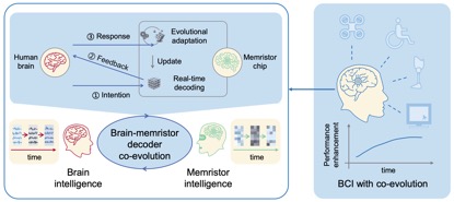 天津大學(xué)與清華大學(xué)的聯(lián)合研究團(tuán)隊(duì)針對這一難題,發(fā)現(xiàn)腦電信號的非平穩(wěn)特性與任務(wù)腦電演變密切相關(guān)。基于此,他們創(chuàng)新性地提出了“雙環(huán)路腦機(jī)協(xié)同演進(jìn)框架”,并通過憶阻器神經(jīng)形態(tài)器件加以實(shí)現(xiàn)。在“雙環(huán)路”框架下,腦與機(jī)的學(xué)習(xí)環(huán)路相互協(xié)同,共同促進(jìn)系統(tǒng)性能的提升。