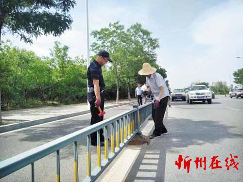 圖為6月5日下午,市交警支隊交通設(shè)施大隊正在更換破損護(hù)欄底座。