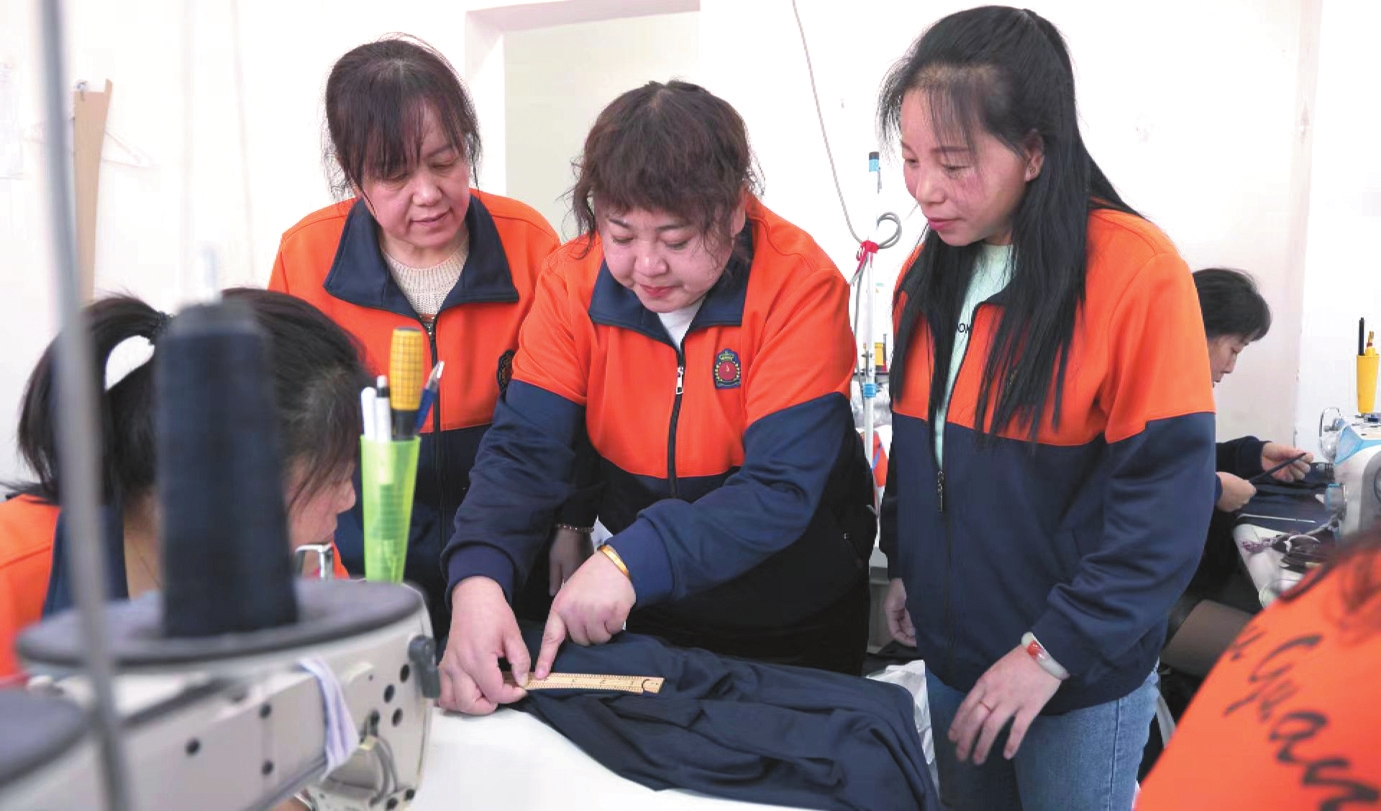 王麗華(中)與姐妹們進(jìn)行縫紉技術(shù)交流。