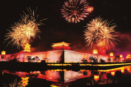 絢爛的焰火在太原古縣城上空綻放。