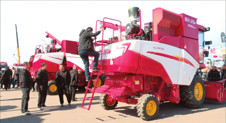 圖為在祁縣的農(nóng)機(jī)市場(chǎng)里,農(nóng)戶們正在了解新農(nóng)機(jī)。本報(bào)通訊員攝