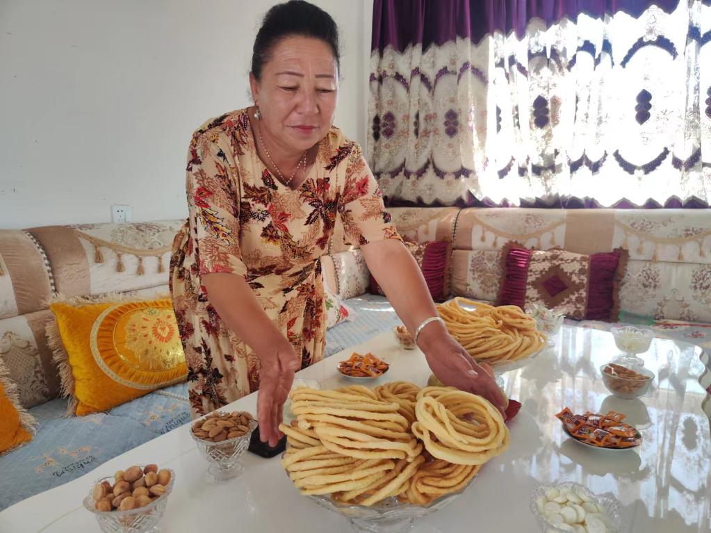6月30日,烏什縣亞曼蘇柯爾克孜族鄉(xiāng)尤勒吐孜布拉克村居民阿曼古麗·熱合曼正在新居里準備茶點。新華社記者 關俏俏 攝