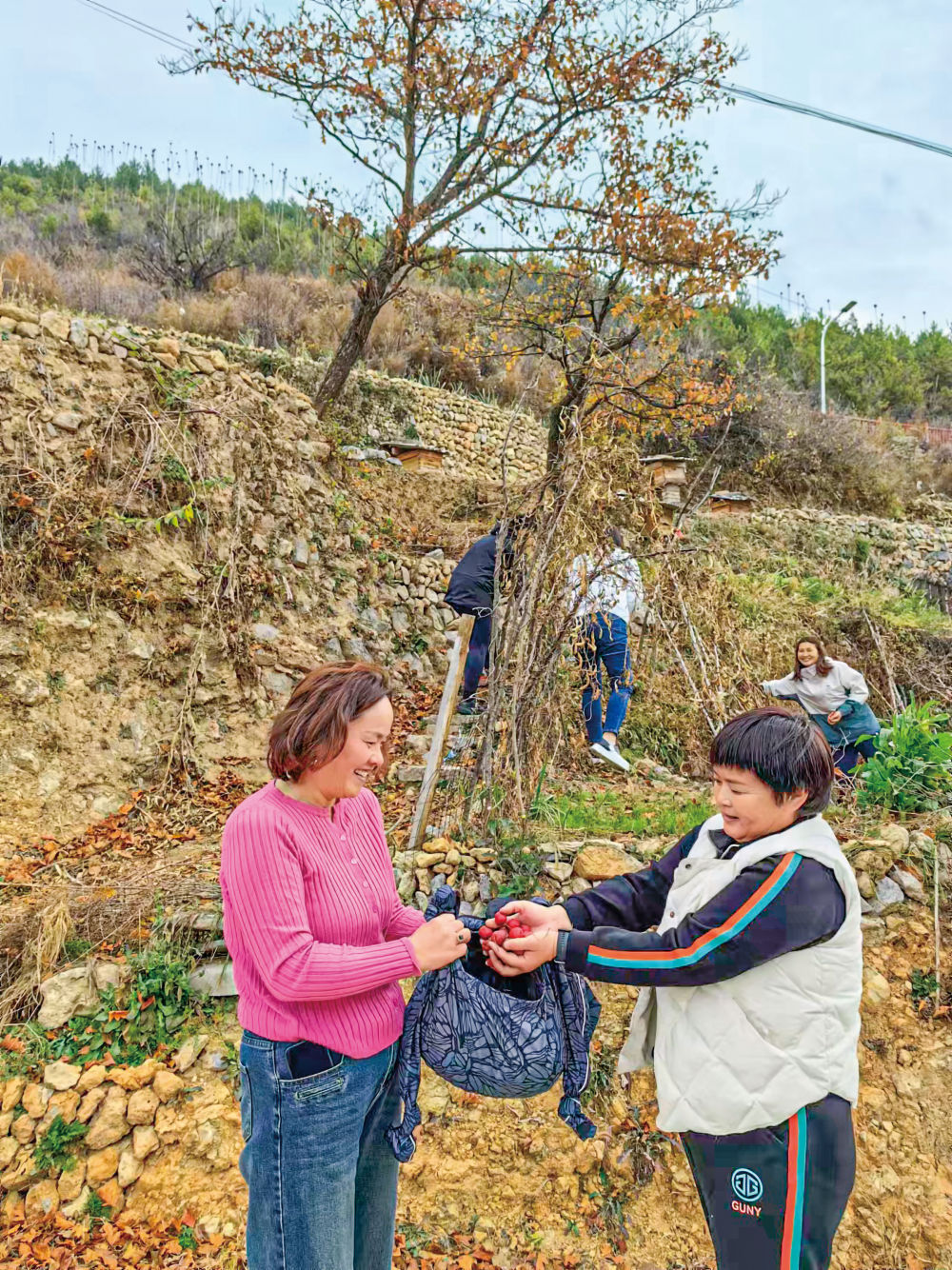 在松廟村的山坡上,一大早就從河南新鄉(xiāng)市長垣市自駕車過來的馬女士(右)和朋友們一起采摘野生的山楂果子,她們每年夏天都要在這里小住幾天避暑。新華每日電訊記者 趙東輝 攝。