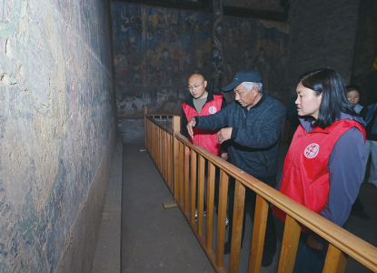4月10日,張東星(左)、王燕燕向當地老者了解正殿西山墻修繕痕跡。