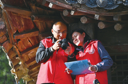 4月10日,張東星(左)、王燕燕在對山門木基層修繕痕跡拍照后進行現場分析。