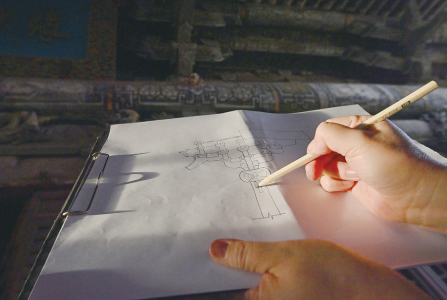 4月9日,趙利芳現場繪制正殿前檐柱頭鋪作。