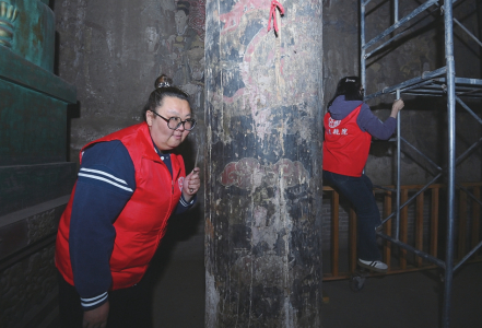 4月10日,張靜通過敲擊聽音來檢測正殿后檐金柱有無中空現象。