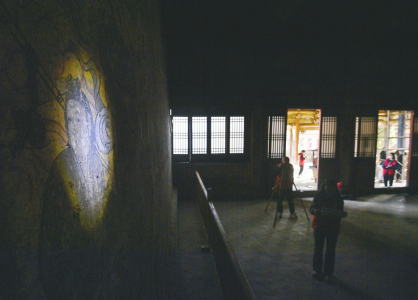 4月10日,山西省文化遺產規(guī)劃研究院勘察設計團隊在高平仙翁廟正殿內借助冷光源進行壁畫病害調查。
