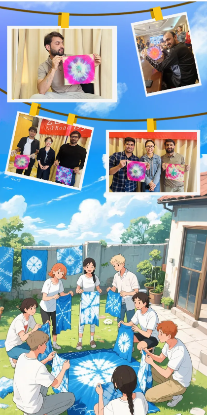 國際青年們認(rèn)真聆聽扎染的歷史淵源與工藝精髓,并通過分步演示,親自體驗“絞纈”技法。留學(xué)生們在素色方巾上折疊、捆扎、浸染,創(chuàng)作出各具特色的紋樣。