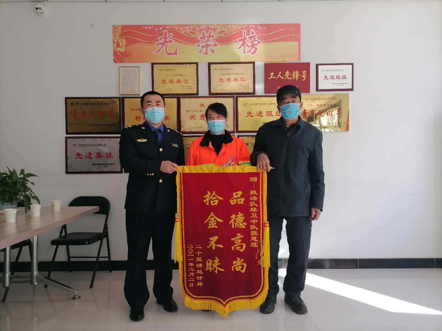 “真是遇到了好心人,我們一家人這下可以安心過個(gè)年了!……”當(dāng)泛華小區(qū)門衛(wèi)趙大爺親手接過失而復(fù)得的巨額現(xiàn)金時(shí),抑制不住內(nèi)心的激動(dòng),緊緊握著環(huán)衛(wèi)女工張慧蓮的手不停地道謝,并送上全家人的心愿“拾金不昧 品德高尚”錦旗。