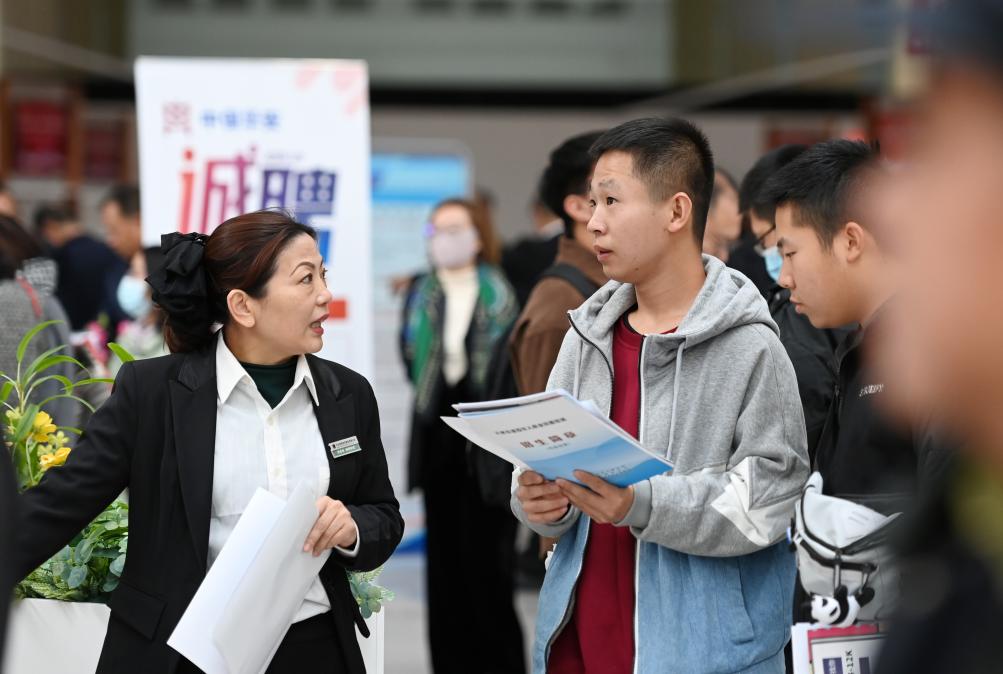 2023年11月10日,天津,求職者在招聘會(huì)現(xiàn)場與用人單位交流。新華社記者 趙子碩 攝