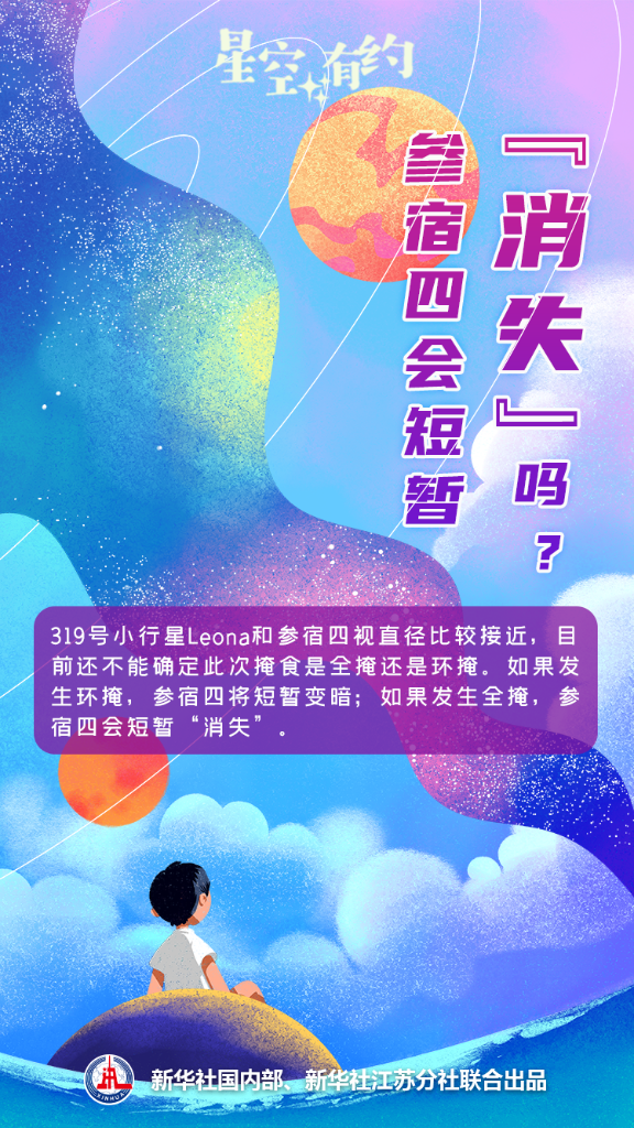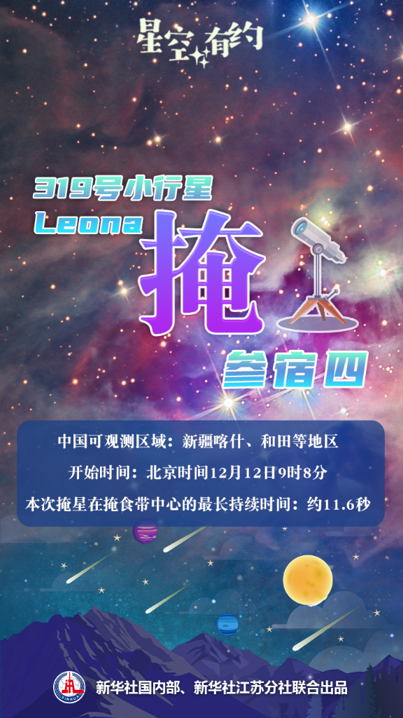 新華社南京12月10日電(記者邱冰清、秦華江)中國科學(xué)院紫金山天文臺科普主管王科超介紹,北京時(shí)間12月12日,319號小行星Leona將掩恒星參宿四。最早能看到本次掩星過程的是中國新疆喀什、和田等地區(qū),開始時(shí)間是當(dāng)日9時(shí)8分。本次掩星在掩食帶中心的最長持續(xù)時(shí)間約為11.6秒。