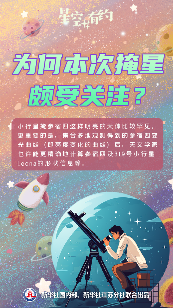 太陽系的行星、小行星等在移動(dòng)時(shí),時(shí)常會掩住遠(yuǎn)處的恒星。不過,小行星掩參宿四這樣明亮的天體比較罕見?!皯{肉眼看到參宿四明顯變暗或‘消失’,將會是一次難得的體驗(yàn)?!蓖蹩瞥榻B說,此次掩星不僅有觀賞性,還具有科學(xué)價(jià)值。集合多地觀測得到的參宿四變光曲線(即亮度變化的曲線)后,天文學(xué)家也許能更精確地計(jì)算參宿四及319號小行星Leona的形狀信息等。