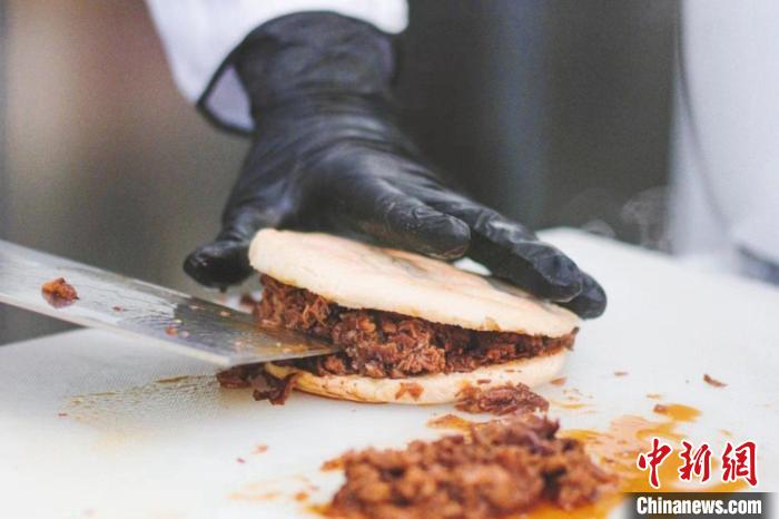 開在意大利米蘭華人街上的中國(guó)小吃店“饃”(Mo Sarpi)制作的肉夾饃。(受訪者供圖)