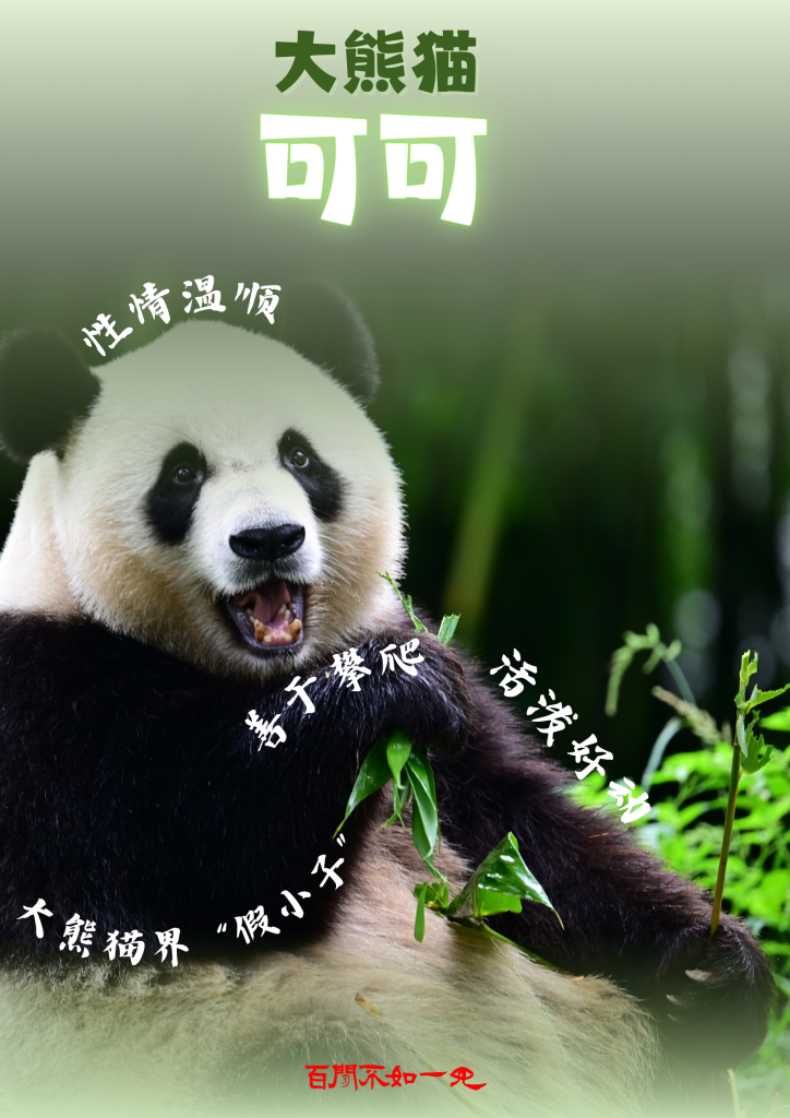 大熊貓“可可”,原名“甜可”,雌性,2019年6月出生,性情溫順、活波好動(dòng),善于攀爬,典型的大熊貓界“假小子”。