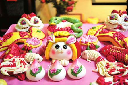 “生肖青蛇臥盤(pán),雙春蛇年生機(jī)盎然;醒獅賀歲,歲歲平安;花開(kāi)富貴葫蘆,福祿到家;可愛(ài)的醒獅兔,蛇盤(pán)兔代代富;平安扣青枝上盛開(kāi)梅花,寓意花開(kāi)富貴、孕育希望、生機(jī)盎然;可愛(ài)福袋,寓意代代有福、福氣滿(mǎn)滿(mǎn);大紅錦鯉寓意好運(yùn)連連……”馮秀說(shuō),今年的花饃圍繞“金蛇送福”這一主題,設(shè)計(jì)了近20個(gè)品種,每款花饃都寓意吉祥和美好祝福。每一款非遺花饃的創(chuàng)意都是基于傳統(tǒng)文化,都是對(duì)傳統(tǒng)文化的致敬,也是人們對(duì)美好生活的期待和向往,“過(guò)年買(mǎi)花饃是吃在嘴里的年味兒,充滿(mǎn)了幸福感,我的花饃顧客來(lái)自全國(guó)各地,有的連續(xù)多年定制,成為了老朋友?!?/p>