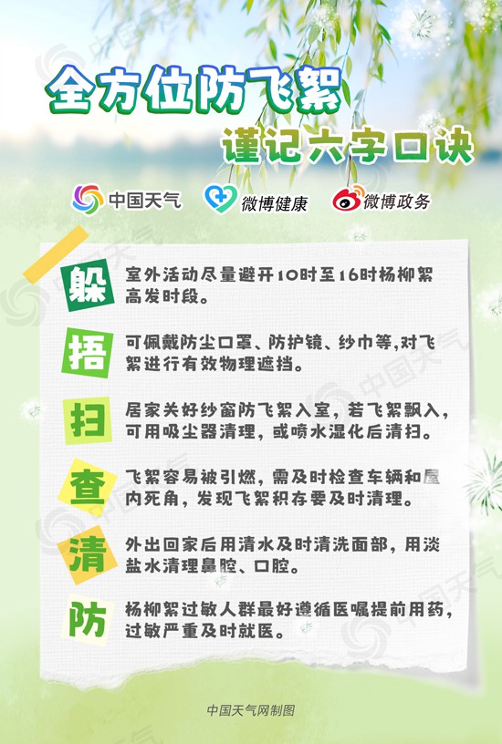 京津冀楊柳絮飄飛可持續(xù)至5月,飛絮中或攜帶花粉、灰塵等多種過(guò)敏原,被人體吸入后,易引發(fā)過(guò)敏性鼻炎、哮喘等疾病。飛絮如何防?如何降低過(guò)敏風(fēng)險(xiǎn)?中國(guó)天氣網(wǎng)總結(jié)了躲、捂、掃、查、清、防6字口訣,助你全方位防護(hù)飛絮。