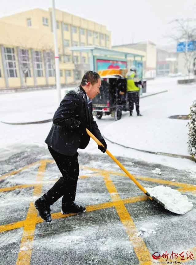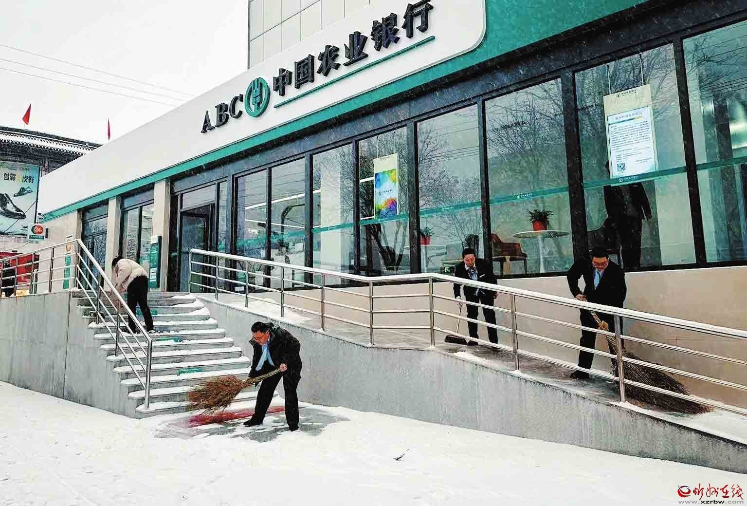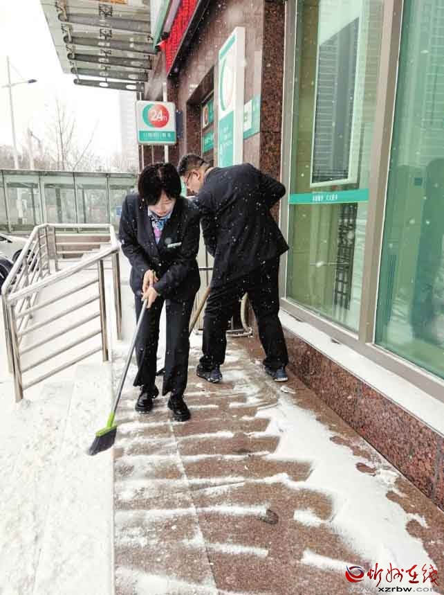 面對(duì)我市首場(chǎng)強(qiáng)降雪,農(nóng)行忻州分行員工以雪為令,及時(shí)清掃網(wǎng)點(diǎn)及周邊區(qū)域,確保服務(wù)通道暢通無阻,以實(shí)際行動(dòng)傳遞了溫暖的金融服務(wù)。(殷俊攝)
