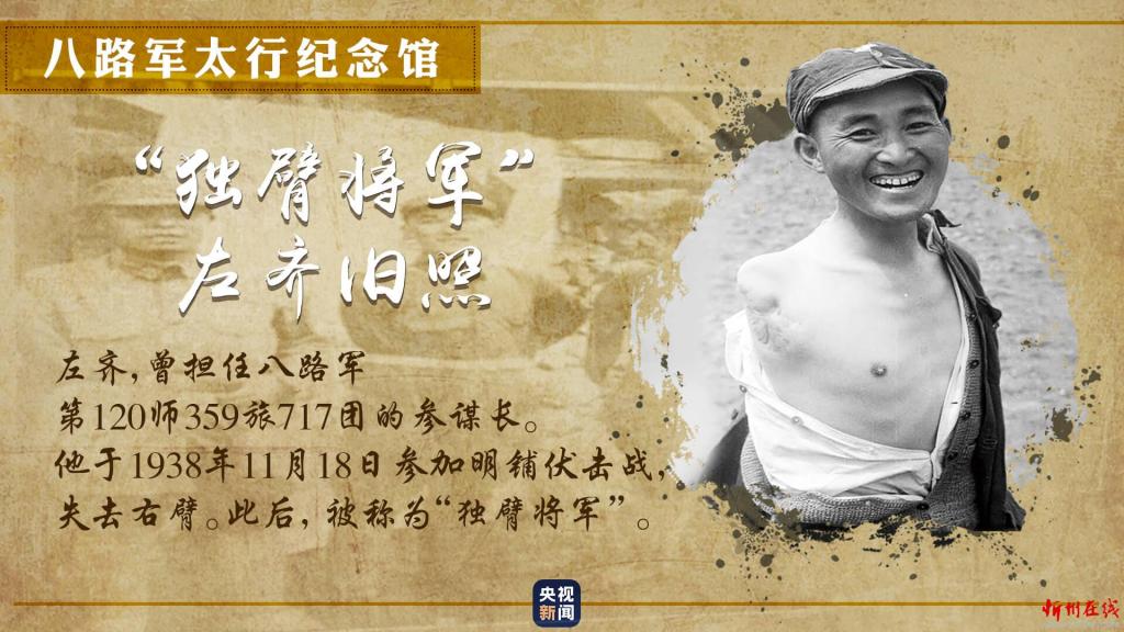 一張獨(dú)臂將軍的舊照,展現(xiàn)出八路軍為爭(zhēng)取民族獨(dú)立,不怕?tīng)奚⒉晃菲D險(xiǎn)的革命英雄主義精神。