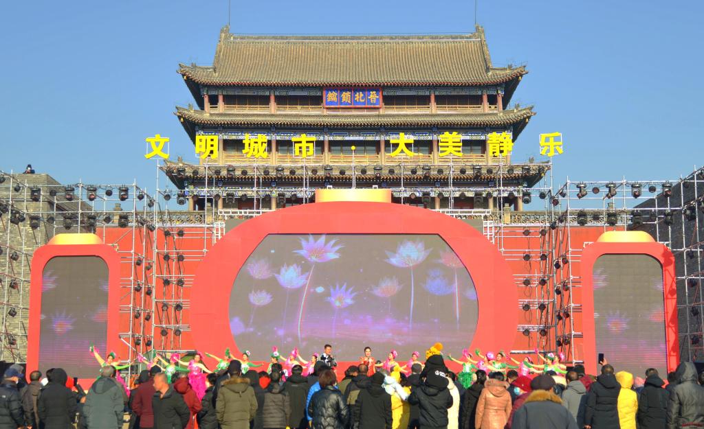 在北城門樓廣場的歌舞現(xiàn)場,二人臺(tái)對唱《拜大年》、歌曲《復(fù)興的力量》《牽著春風(fēng)進(jìn)山村》、舞蹈《幸福中國一起走》、北路梆子《黃河管子聲》選段等精彩的節(jié)目陸續(xù)登臺(tái),贏得廣大市民朋友的陣陣掌聲。