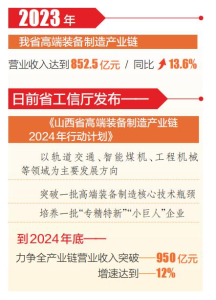 省工信廳日前發(fā)布《山西省高端裝備制造產(chǎn)業(yè)鏈2024年行動計劃》,確立年度推進目標:以軌道交通、智能煤機、工程機械等領(lǐng)域為主要發(fā)展方向,突破一批高端裝備制造核心技術(shù)瓶頸,培養(yǎng)一批“專精特新”“小巨人”企業(yè),提升全產(chǎn)業(yè)鏈科技創(chuàng)新能力,強化高端裝備制造供應(yīng)鏈穩(wěn)定性和配套能力。并提出,到2024年底,力爭全產(chǎn)業(yè)鏈營業(yè)收入突破950億元,增速達到12%。
