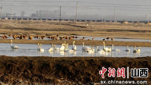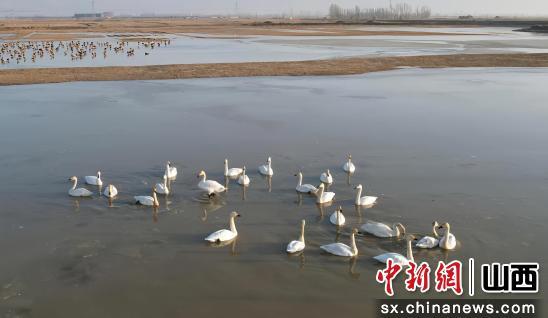 中新網(wǎng)山西新聞3月21日電 白天鵝是雁行目鴨科動(dòng)物,國(guó)家二級(jí)保護(hù)動(dòng)物,全球易危物種。近日,數(shù)十只白天鵝飛抵山西陽(yáng)高縣白登河,并在此歇腳休息。