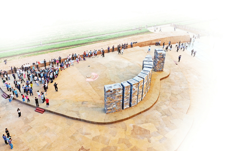 市民在襄汾縣陶寺遺址觀象臺(tái),了解古代天文歷法。李現(xiàn)俊攝