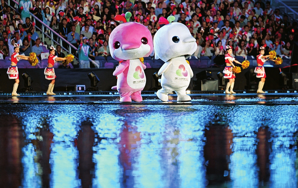 第十五屆全國運(yùn)動(dòng)會(huì)吉祥物“喜洋洋”和“樂融融”在開幕式現(xiàn)場(chǎng)表演。圖片均為開幕式表演現(xiàn)場(chǎng)。 本版圖片均來源新華社