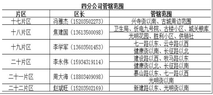 近期,忻州熱力有限公司收到很多用戶上門反饋,普遍反映客服熱線占線時間太長,無法及時反映供熱情況,導致用戶遇到供熱相關問題或故障無法及時反饋。根據群眾目前遇到的困難,忻州熱力有限公司公布了22個供熱片區(qū)及負責人聯系方式,以便用戶及時反饋。
