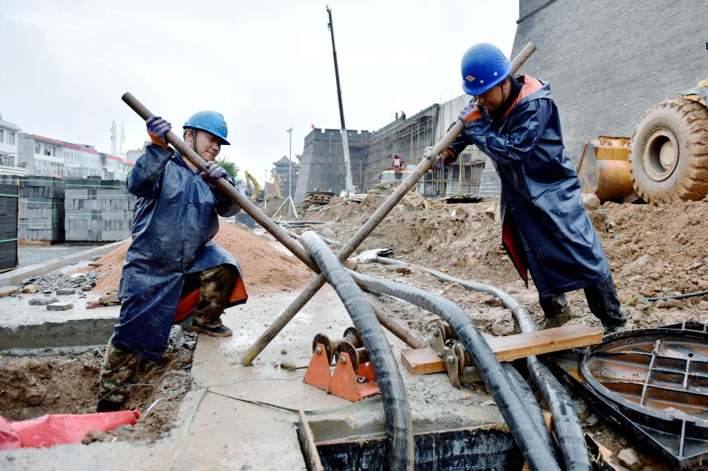 國(guó)網(wǎng)忻州供電公司員工在秀容古城電力配套建設(shè)現(xiàn)場(chǎng)敷設(shè)電纜