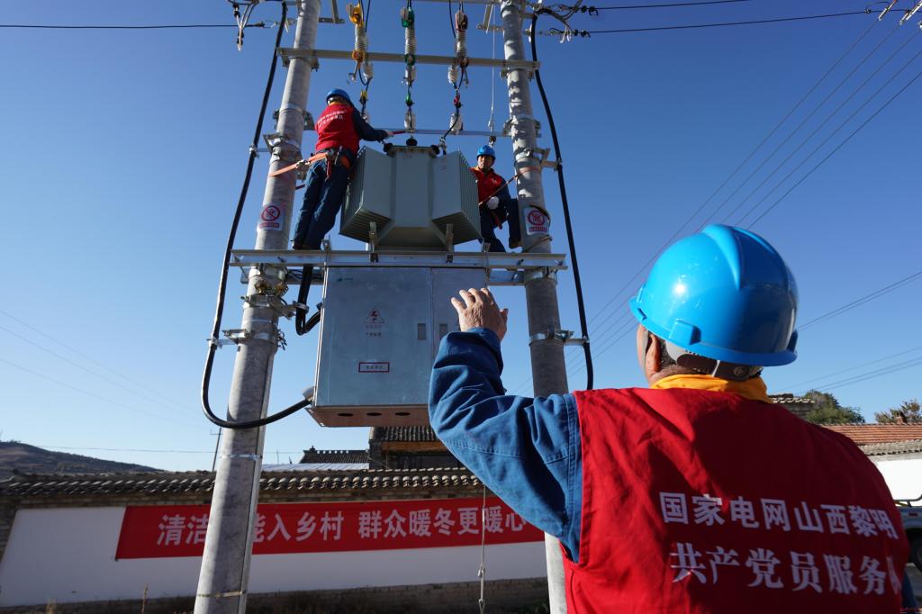 山西-電網(wǎng)建設(shè)-2020年10月3日,國(guó)網(wǎng)岢嵐縣供電公司員工在團(tuán)城子村“煤改電”現(xiàn)場(chǎng)緊固高壓引線設(shè)備線夾(邊武攝)
