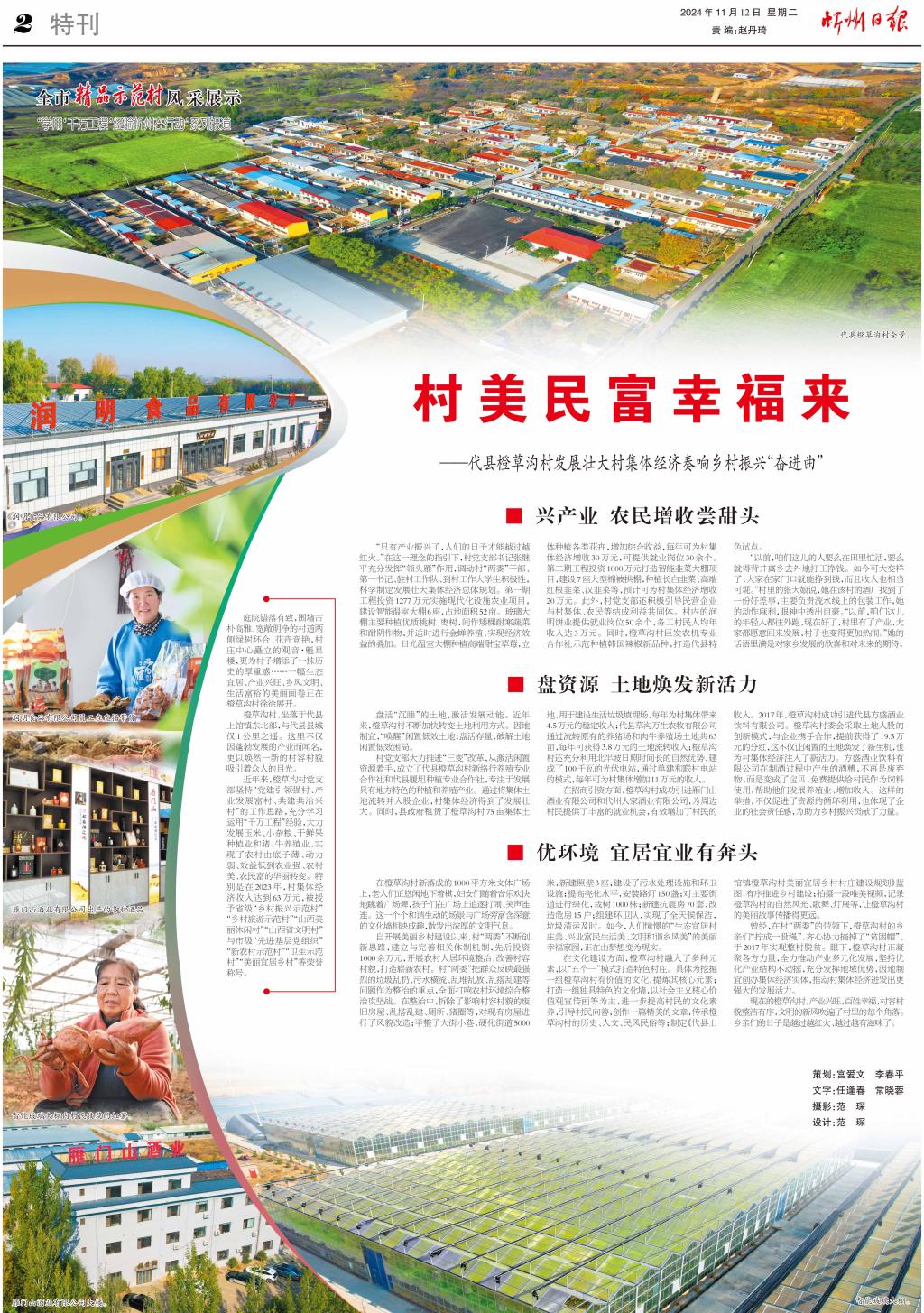 “只有產(chǎn)業(yè)振興了,人們的日子才能越過(guò)越紅火?!痹谶@一理念的指引下,村黨支部書(shū)記張繼平充分發(fā)揮“領(lǐng)頭雁”作用,調(diào)動(dòng)村“兩委”干部、第一書(shū)記、駐村工作隊(duì)、到村工作大學(xué)生積極性,科學(xué)制定發(fā)展壯大集體經(jīng)濟(jì)總體規(guī)劃。第一期工程投資1277萬(wàn)元實(shí)施現(xiàn)代化設(shè)施農(nóng)業(yè)項(xiàng)目,建設(shè)智能溫室大棚6座,占地面積52畝。玻璃大棚主要種植優(yōu)質(zhì)桃樹(shù)、棗樹(shù),間作矮棵耐寒蔬菜和耐陰作物,并適時(shí)進(jìn)行金蟬養(yǎng)殖,實(shí)現(xiàn)經(jīng)濟(jì)效益的疊加。日光溫室大棚種植高端甜寶草莓,立體種植各類花卉,增加綜合收益,每年可為村集體經(jīng)濟(jì)增收30萬(wàn)元,可提供就業(yè)崗位30余個(gè)。第二期工程投資1000萬(wàn)元打造智能韭菜大棚項(xiàng)目,建設(shè)7座大型棉被拱棚,種植長(zhǎng)白韭菜、高端紅根韭菜、漢韭菜等,預(yù)計(jì)可為村集體經(jīng)濟(jì)增收20萬(wàn)元。此外,村黨支部還積極引導(dǎo)民營(yíng)企業(yè)與村集體、農(nóng)民等結(jié)成利益共同體。村內(nèi)的潤(rùn)明餅業(yè)提供就業(yè)崗位50余個(gè),務(wù)工村民人均年收入達(dá)3萬(wàn)元。同時(shí),橙草溝村巨發(fā)農(nóng)機(jī)專業(yè)合作社示范種植韓國(guó)辣椒新品種,打造代縣特色試點(diǎn)。