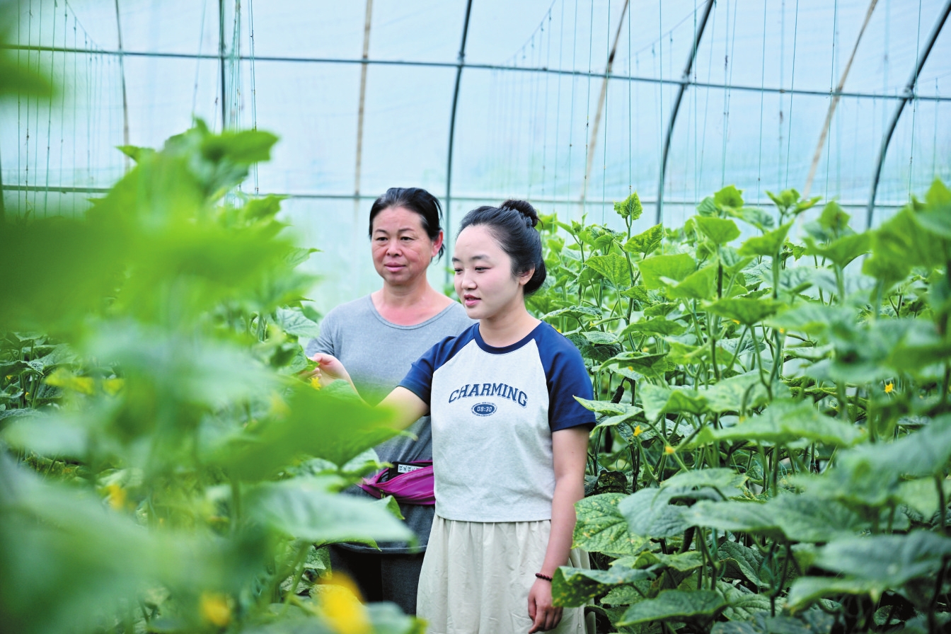保德縣暖泉村駐村大學(xué)生正在觀察黃瓜長勢。本報(bào)記者 馮曉磊攝