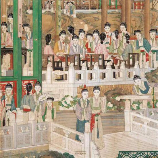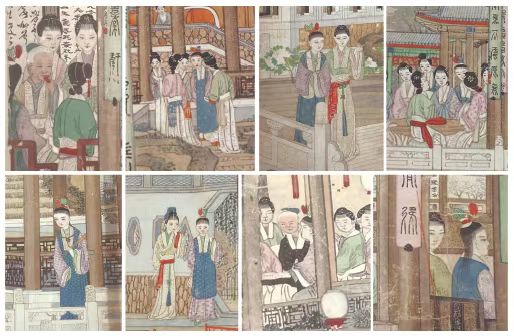 《大觀(guān)園圖》小姐、丫鬟的不同發(fā)型前后面,上列為小姐,下列為丫鬟